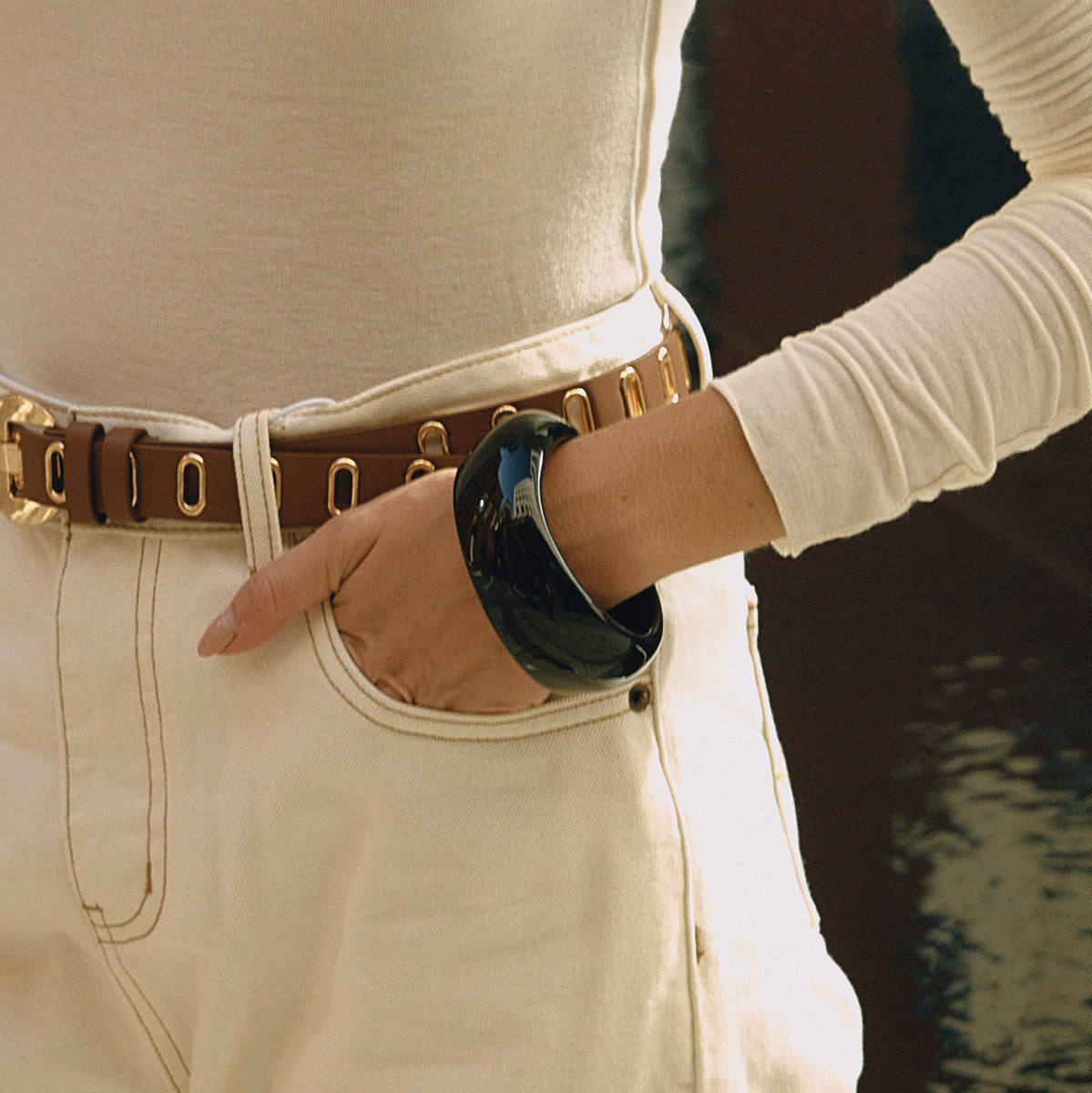 This bold statement bangle features a high‑shine black dome profile in waterproof, hypoallergenic stainless steel, giving it a sleek, sculptural look. With an outer diameter of about 6.34 cm, a height of 3.48 cm, an inner circumference of roughly 28 cm and a substantial 96.6 g weight, it sits as a heavy, fashion‑forward cuff best suited for special outfits or stacked with slimmer bracelets.