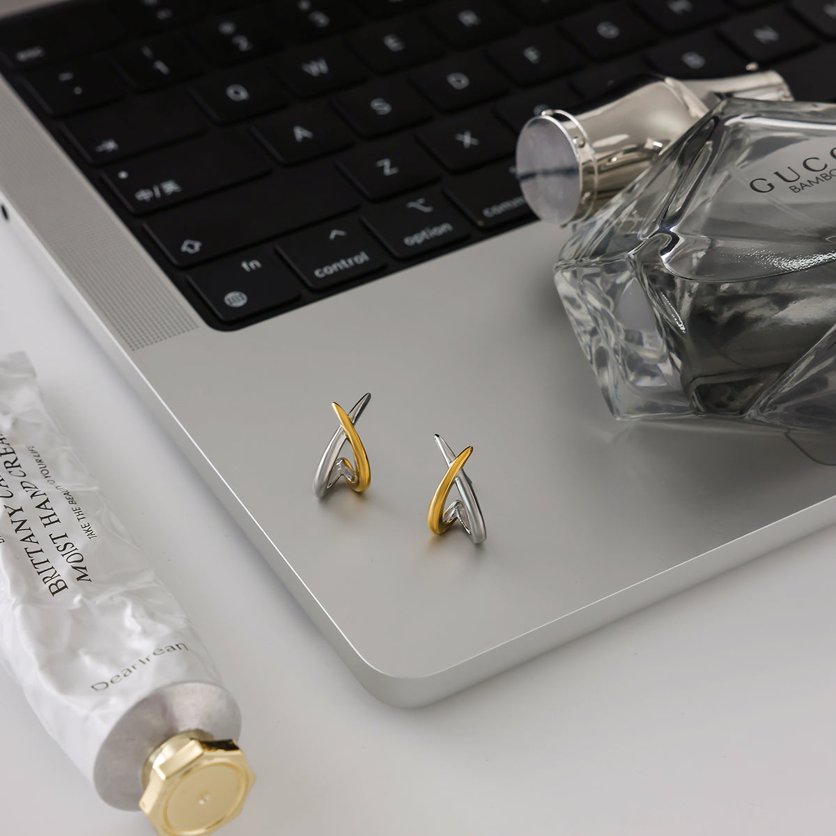 These waterproof, hypoallergenic earrings feature an intertwined sculptural hoop design combining polished silver‑tone and gold‑tone stainless steel for a modern, two‑tone look. Each earring is approximately 2.03 cm tall with about 1.00 cm internal width and weighs around 2.8 g, giving a lightweight yet bold presence.